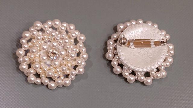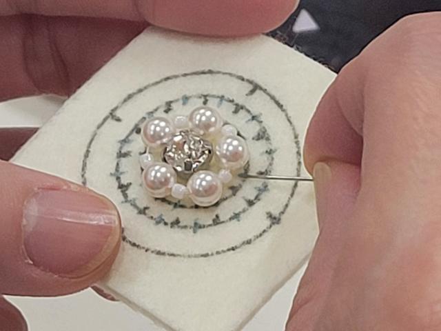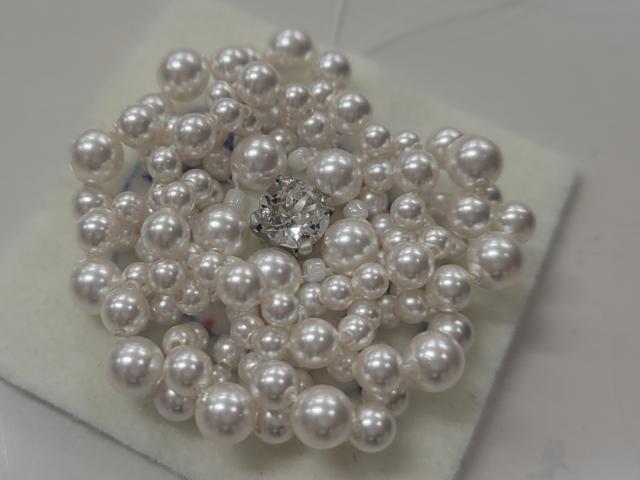 大きさの異なるパールを使用し、お花の様な形にしていきます。