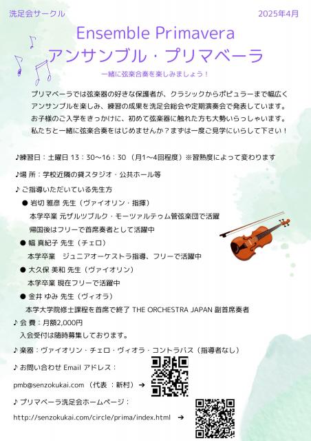 弦楽の好きな保護者が集まって、定期演奏会に向けて弦楽アンサンブルを楽しんでいます。初心者から始められた方も多く、クラシックからポピュラーまで幅広い曲を練習しています。見学も大歓迎です。皆様のご参加を、心よりお待ちしております。